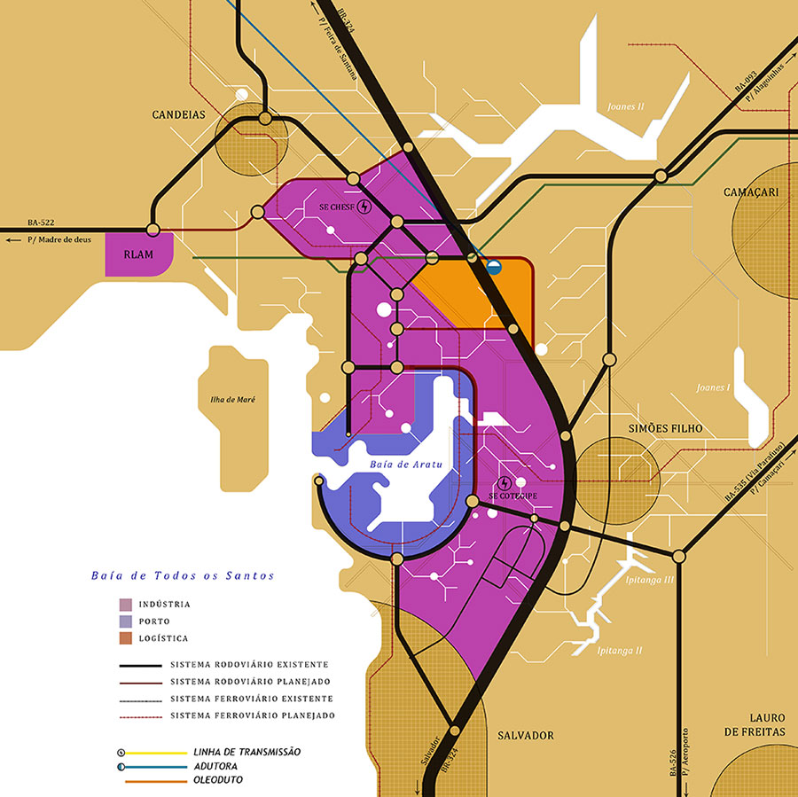 A composição do sistema viário a partir do Anel Portuário e da curvatura da BR-324 em torno da concavidade da Baía de Aratu altera a leitura da estrutura urbana do CIA, convertendo sua malha para uma tipologia mais eficiente, radial, nucleada pelo Canal de Cotegipe, o que torna o porto a matriz estrutural de transporte e logística do Centro Industrial de Aratu.