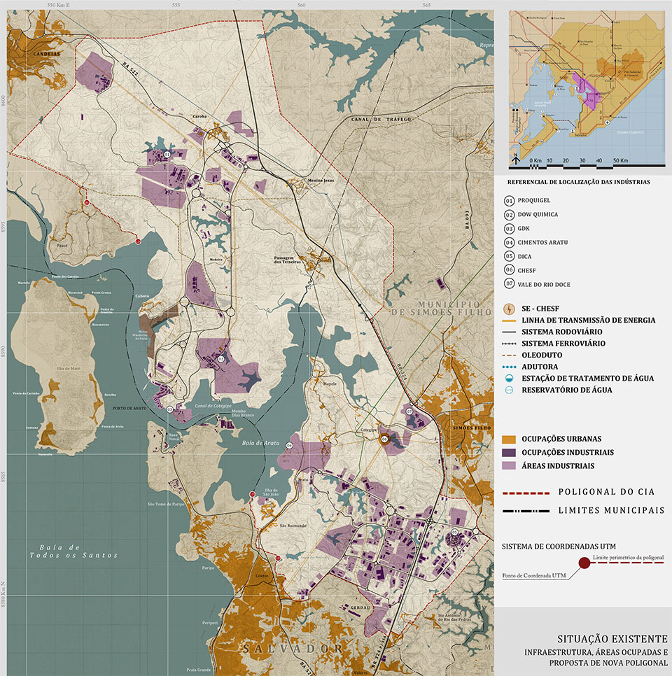 Os sucessivos planejamentos direcionados ao desenvolvimento do Centro Industrial de Aratu, em 1967 e 1980, indicaram importantes diretrizes tanto para o desenvolvimento do CIA, quanto da região, que ainda figuram importantes conceitos espaciais e foram considerados neste presente Plano de Diretrizes. No entanto, esta versão fundamenta-se sobre um novo contexto urbano e de estratégias políticas e econômicas direcionadas a um reposicionamento tipológico que sugere uma reconfiguração espacial, de atributos estruturais mais adequados a esta nova proposta.